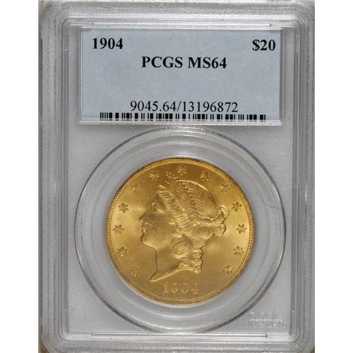 <B>1904 $20 MS64 PCGS.</B></I> This highly lustrous khaki-gold type coin has the preservation of a finer grade, but the peripheries are softly struck. The major devices, however, are crisply defined.<BR><BR><b>Shipping:</b> Coins & Currency (<a target="_blank" href="http://www.heritageauctions.com/common/shipping.php">view shipping information</a>)