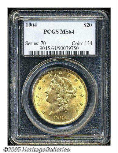 <B>1904<$20> MS64 PCGS.</B></I> This readily available double eagle displays vibrant luster and warm apricot-gold surfaces. The design features are well impressed throughout, and a few minute obverse marks define the grade.