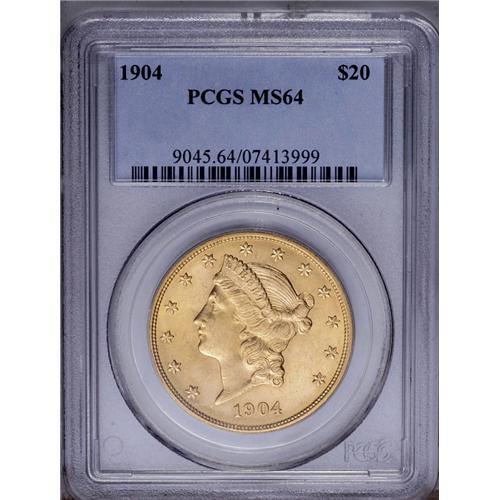 <B>1904<$20> MS64 PCGS.</B></I> This sharply impressed near-Gem has a beautifully preserved reverse, and the obverse is also clean for the designated grade. Yellow-gold surfaces display radiant luster.