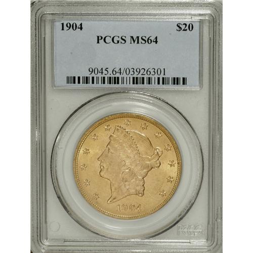 <B>1904 $20 MS64 PCGS.</B></I> This shimmering gold type coin has undisturbed fields and a decisive strike. A few marks are noted on the portrait. The reverse is well preserved.<BR><BR><b>Shipping:</b> Coins & Currency (<a target="_blank" href="http://www.heritageauctions.com/common/shipping.php">view shipping information</a>)