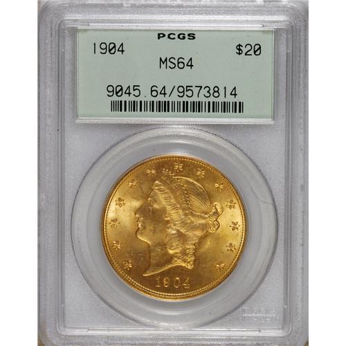 <B>1904 $20 MS64 PCGS.</B></I> Vivacious luster bathes this honey and lime-tinged near-Gem. The reverse is gorgeous, and the obverse has only minor contact. Certified in an old green label holder.<BR><BR><b>Shipping:</b> Coins & Currency (<a target="_blank" href="http://www.heritageauctions.com/common/shipping.php">view shipping information</a>)