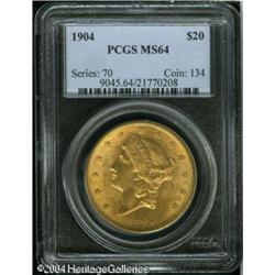 1904 $20 MS64 PCGS. Well struck and highly lustrou <B>1904 $20 MS64 PCGS.</B></I> Well struck and highly lustrous, with rich coloration and a few wispy field marks and light contact blemishes on the obverse. A sparkling, really pretty near-Gem. <BR><BR><B>Important notice:</B> Heritage usually auctions material at the rate of 200-250 lots per hour. On some occasions eBay Live bid software or the Internet may not be able to keep up with the pace of the auction. We recommend placing a realistic absentee bid now as insurance to avoid disappointment. Occasionally the auctioneer may eliminate or reject an eBay Live bid, and the auctioneer may also reopen a lot after the close of the eBay live bidding (usually because we missed an audience bid), and may reject your bid even if it shows you as the winning bidder. By bidding via eBay Live, you agree that Heritage may award the lot to another bidder at its sole discretion under the circumstances described above or any other reasonable circumstances. Since eBay bids are not shown to us until we open the lot on the floor, we treat those bids just like floor bids. In most cases the floor responds before the eBay bid is presented to us, due to Internet lag time, so for consistency we have made it a policy that floor bids are always considered first over tie eBay live bids. Also please note that all Heritage lots purchased through eBay Live carry a 20% Buyer's Premium. Please make sure you read the Terms and Conditions before you bid. This lot is being auctioned in conjunction with a live floor auction by Heritage Galleries & Auctioneers. All final auction and invoice information will be supplied by Heritage Galleries & Auctioneers, and all other information should be considered preliminary. Lot:7039