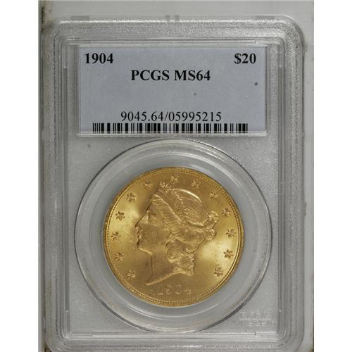 <B>1904 $20 MS64 PCGS.</B></I> Well struck with a pleasing frosty sheen and light coloration over both sides. An abrasion on Liberty's chin precludes a higher grade.<BR><BR><b>Shipping:</b> Coin/Currency (<a target="_blank" href="http://www.heritageauctions.com/common/shipping.php">view shipping information</a>)