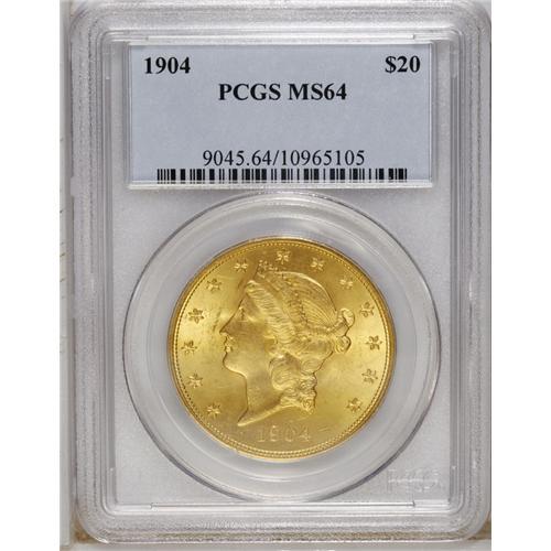 <B>1904 $20 MS64 PCGS.</B></I> Lovely lime-green toning adorns each side of this highly lustrous near-Gem. The striking details are excellent and surface marks are minimal.<BR><BR><b>Shipping:</b> Coin/Currency (<a target="_blank" href="http://www.heritageauctions.com/common/shipping.php">view shipping information</a>) <BR><BR><B>Importan