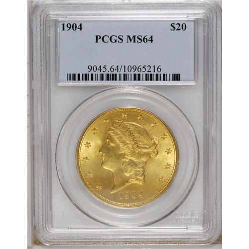 <B>1904 $20 MS64 PCGS.</B></I> Typically well struck with flashy luster and lovely lime-gold toning. A handful of trivial surface blemishes limit the grade.<BR><BR><b>Shipping:</b> Coin/Currency (<a target="_blank" href="http://www.heritageauctions.com/common/shipping.php">view shipping information</a>) <BR><BR><B>Importan