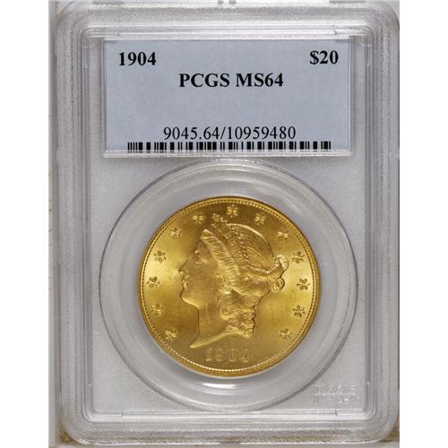 <B>1904 $20 MS64 PCGS.</B></I> An impeccable near-Gem example, this piece is fully struck with nearly flawless surfaces and brilliant yellow-gold color.<BR><BR><b>Shipping:</b> Coin/Currency (<a target="_blank" href="http://www.heritageauctions.com/common/shipping.php">view shipping information</a>) <BR><BR><B>Importan