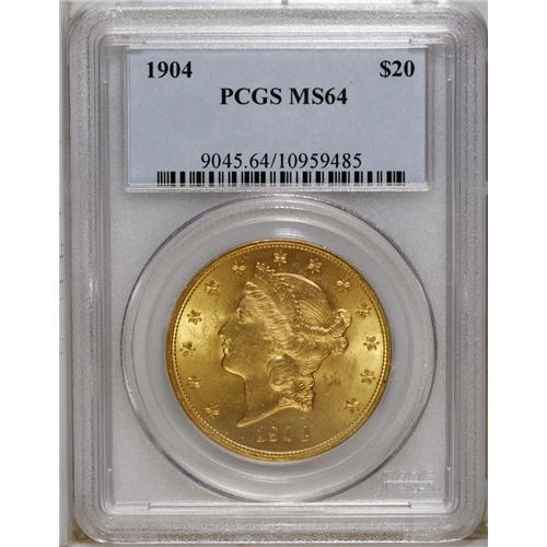 <B>1904 $20 MS64 PCGS.</B></I> A wonderful example of this well-known date with delightfully clean fields and a tiny die crack running through the first two letters of the date.<BR><BR><b>Shipping:</b> Coin/Currency (<a target="_blank" href="http://www.heritageauctions.com/common/shipping.php">view shipping information</a>) <BR><BR><B>Importan