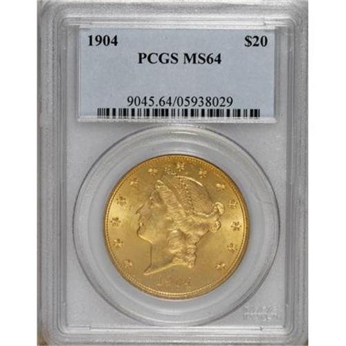 <B>1904 $20 MS64 PCGS.</B></I> A decisively struck and flashy Choice example of the quintessential Liberty double eagle issue, lemon-gold with hints of deeper and lighter colors. Appealing with just a few too many marks for a finer grade.<BR><BR><b>Shipping:</b> Coins & Currency (<a target="_blank" href="http://www.heritageauctions.com/common/shipping.php">view shipping information</a>)
