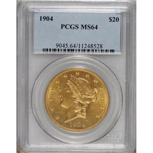 <B>1904 $20 MS64 PCGS.</B></I> The fields of this piece show a noticeable trace of semiprooflikeness on each side. As such, this should be of additional interest to collectors because of the extra flash. The fully struck surfaces are upper-end for the MS64 grade.<BR><BR><b>Shipping:</b> Coins & Currency (<a target="_blank" href="http://www.heritageauctions.com/common/shipping.php">view shipping information</a>)