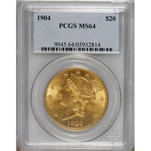 <B>1904 $20 MS64 PCGS.</B></I> This example is sharply struck and well preserved, with lime-gold surfaces that are minimally marked and close to Gem quality. The most common issue in the Liberty Head double eagle series, and an ideal choice for type purposes. <BR><BR><b>Shipping:</b> Coins & Currency (<a target="_blank" href="http://www.heritageauctions.com/common/shipping.php">view shipping information</a>)