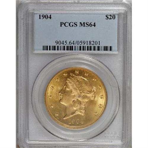 <B>1904 $20 MS64 PCGS.</B></I> A sharply struck and uncommonly attractive near-Gem representative of this ever-popular Liberty type issue. Gleaming with a touch of haze in the fields and faint, grade-defining marks on the devices.<BR><BR><B>Coin Engraver:</B> James B. Longacre<BR><BR><b>Shipping:</b> Coins & Currency (<a target="_blank" href="http://www.heritageauctions.com/common/shipping.php">view shipping information</a>)