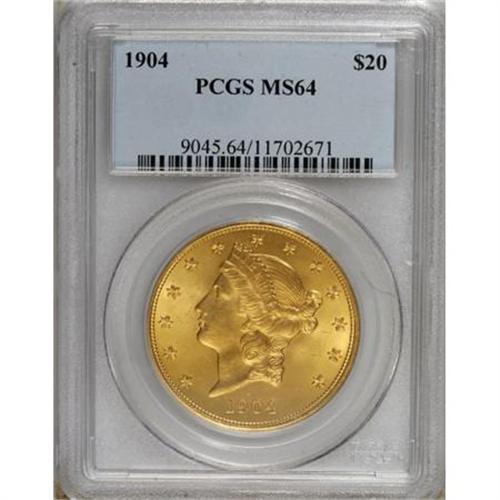 <B>1904 $20 MS64 PCGS.</B></I> A pleasing near-Gem that exudes potent luster from its peach-gold surfaces. The design features are well impressed throughout, and a few minute, grade-consistent marks are visible over each side.<BR><BR><B>Coin Engraver:</B> James B. Longacre<BR><BR><b>Shipping:</b> Coins & Currency (<a target="_blank" href="http://www.heritageauctions.com/common/shipping.php">view shipping information</a>)