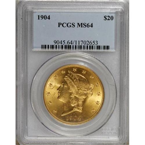 <B>1904 $20 MS64 PCGS.</B></I> An eye-catching exemplar of this noted type issue, boldly impressed with powerful luster on both sides. The sun-gold obverse contrasts with the lighter lemon-gold reverse.<BR><BR><B>Coin Engraver:</B> James B. Longacre<BR><BR><b>Shipping:</b> Coins & Currency (<a target="_blank" href="http://www.heritageauctions.com/common/shipping.php">view shipping information</a>)