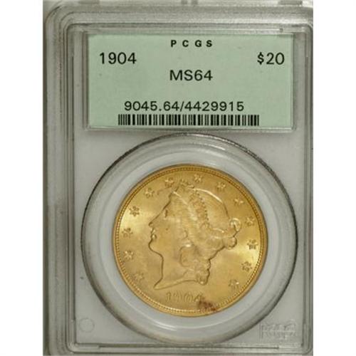 <B>1904 $20 MS64 PCGS.</B></I> A boldly impressed Choice example of this popular type issue, yellow-orange with slightly subdued luster. A cherry-red copper spot to the right of the date adds character to the piece.<BR><BR><B>Coin Engraver:</B> James B. Longacre<BR><BR><b>Shipping:</b> Coins & Currency (<a target="_blank" href="http://www.heritageauctions.com/common/shipping.php">view shipping information</a>)