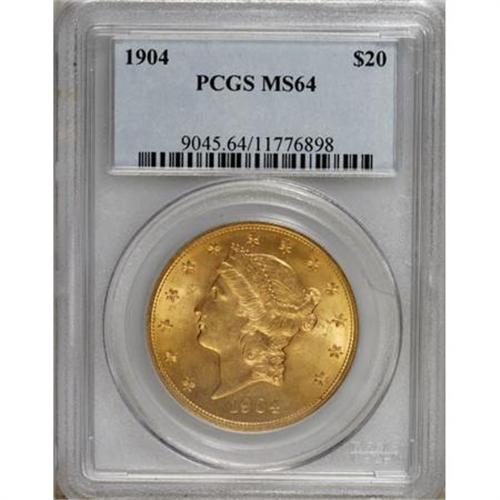 <B>1904 $20 MS64 PCGS.</B></I> PCGS Population (23622/3260). NGC Census: (27204/5351). Mintage: 6,256,797. Numismedia Wsl. Price for NGC/PCGS coin in MS64: $1,260. (#9045)<BR><BR><B>Coin Engraver:</B> James B. Longacre<BR><BR><b>Shipping:</b> Coins & Currency (<a target="_blank" href="http://www.heritageauctions.com/common/shipping.php">view shipping information</a>)