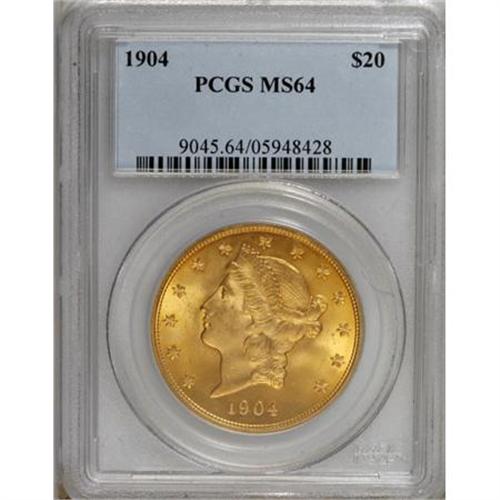 <B>1904 $20 MS64 PCGS.</B></I> PCGS Population (23868/3274). NGC Census: (27373/5370). Mintage: 6,256,797. Numismedia Wsl. Price for NGC/PCGS coin in MS64: $1,250. (#9045)<BR><BR><B>Coin Engraver:</B> James B. Longacre<BR><BR><b>Shipping:</b> Coins & Currency (<a target="_blank" href="http://www.heritageauctions.com/common/shipping.php">view shipping information</a>)