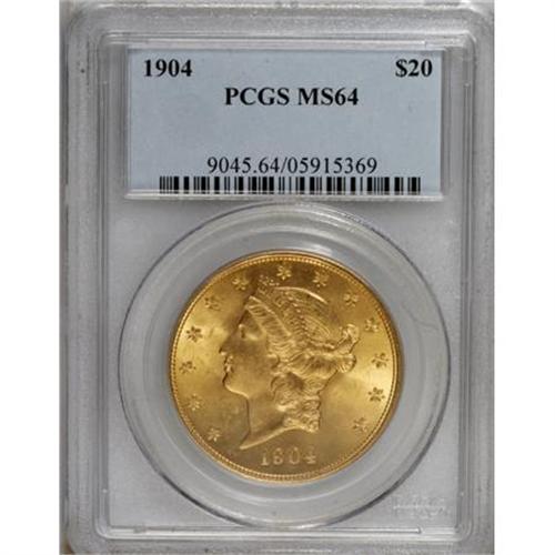 <B>1904 $20 MS64 PCGS.</B></I> PCGS Population (23906/3276). NGC Census: (27373/5370). Mintage: 6,256,797. Numismedia Wsl. Price for NGC/PCGS coin in MS64: $1,250. (#9045)<BR><BR><B>Coin Engraver:</B> James B. Longacre<BR><BR><b>Shipping:</b> Coins & Currency (<a target="_blank" href="http://www.heritageauctions.com/common/shipping.php">view shipping information</a>)