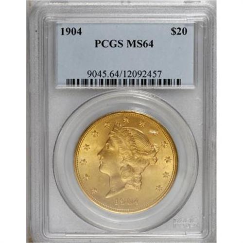 <B>1904 $20 MS64 PCGS.</B></I> A sharply struck and slightly satiny yellow-orange representative of this available 20th century Liberty double eagle issue. Pleasingly preserved for the grade, though a mark on the chin precludes Gem status.<BR><BR><B>Coin Engraver:</B> James B. Longacre<BR><BR><b>Shipping:</b> Coins & Currency (<a target="_blank" href="http://www.heritageauctions.com/common/shipping.php">view shipping information</a>)