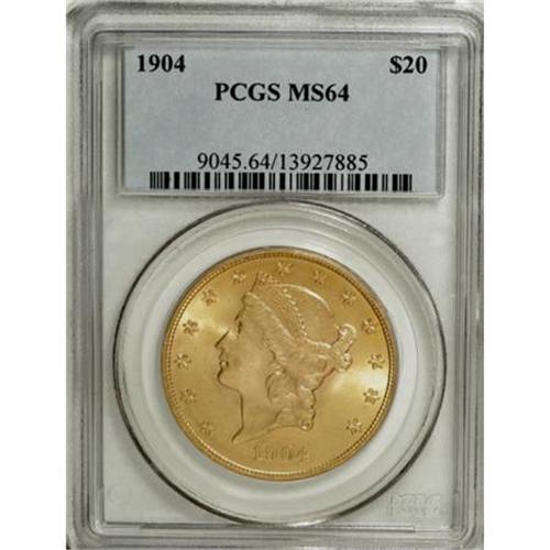 <B>1904 $20 MS64 PCGS.</B></I> A satiny and sharply struck example of this readily available issue, predominantly sun-gold with a slightly lighter obverse than reverse. The 1904's mintage of over 6.2 million pieces would be the highest for the denomination until 1928.<BR><BR><B>Coin Engraver:</B> James B. Longacre<BR><BR><b>Shipping:</b> Coins & Currency (<a target="_blank" href="http://www.heritageauctions.com/common/shipping.php">view shipping information</a>)