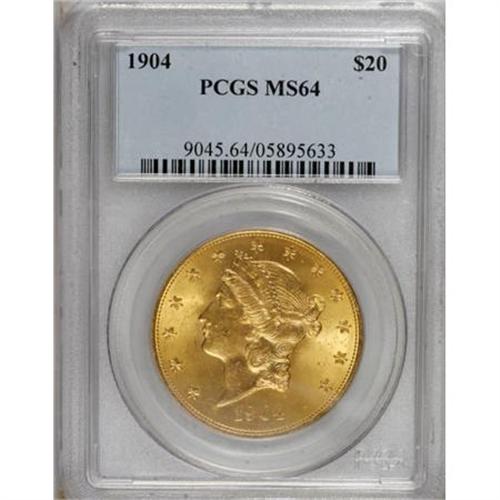<B>1904 $20 MS64 PCGS.</B></I> A solidly struck and satiny example of this ubiquitous Longacre double eagle issue, orange-gold in the fields with paler wheat-gold centers. Above-average for the grade.<BR><BR><B>Coin Engraver:</B> James B. Longacre<BR><BR><b>Shipping:</b> Coins & Currency (<a target="_blank" href="http://www.heritageauctions.com/common/shipping.php">view shipping information</a>)