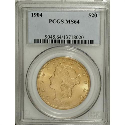 <B>1904 $20 MS64 PCGS.</B></I> This impressive gold type coin has original butter-gold and olive toning. The strike is penetrating, and the eye appeal is superior, since there are no obvious marks.<BR><BR><B>Coin Engraver:</B> James B. Longacre<BR><BR><b>Shipping:</b> Coins & Currency (<a target="_blank" href="http://www.heritageauctions.com/common/shipping.php">view shipping information</a>)