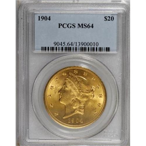 <B>1904 $20 MS64 PCGS.</B></I> PCGS Population (24141/3357). NGC Census: (27373/5370). Mintage: 6,256,797. Numismedia Wsl. Price for NGC/PCGS coin in MS64: $1,250. (#9045)<BR><BR><B>Coin Engraver:</B> James B. Longacre<BR><BR><b>Shipping:</b> Coins & Currency (<a target="_blank" href="http://www.heritageauctions.com/common/shipping.php">view shipping information</a>)