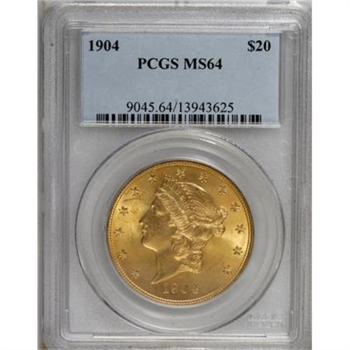 <B>1904 $20 MS64 PCGS.</B></I> PCGS Population (24141/3357). NGC Census: (27373/5370). Mintage: 6,256,797. Numismedia Wsl. Price for NGC/PCGS coin in MS64: $1,250. (#9045)<BR><BR><B>Coin Engraver:</B> James B. Longacre<BR><BR><b>Shipping:</b> Coins & Currency (<a target="_blank" href="http://www.heritageauctions.com/common/shipping.php">view shipping information</a>)