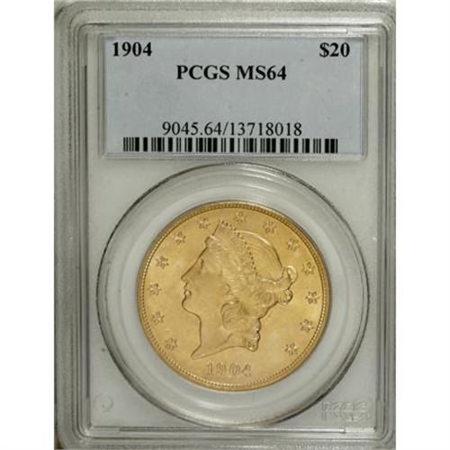 <B>1904 $20 MS64 PCGS.</B></I> PCGS Population (24137/3357). NGC Census: (27373/5370). Mintage: 6,256,797. Numismedia Wsl. Price for NGC/PCGS coin in MS64: $1,250. (#9045)<BR><BR><B>Coin Engraver:</B> James B. Longacre<BR><BR><b>Shipping:</b> Coins & Currency (<a target="_blank" href="http://www.heritageauctions.com/common/shipping.php">view shipping information</a>)