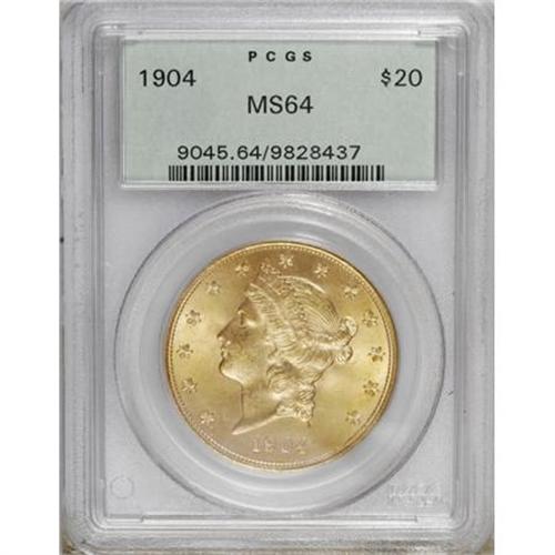 <B>1904 $20 MS64 PCGS.</B></I> This lustrous sun-gold near-Gem has splendidly smooth surfaces and a precise strike. The 1904 is notoriously common in Mint State, but examples with such exemplary eye appeal are under strong type demand. Encapsulated in a green label holder.<BR><BR><B>Coin Engraver:</B> James B. Longacre<BR><BR><b>Shipping:</b> Coins & Currency (<a target="_blank" href="http://www.heritageauctions.com/common/shipping.php">view shipping information</a>)