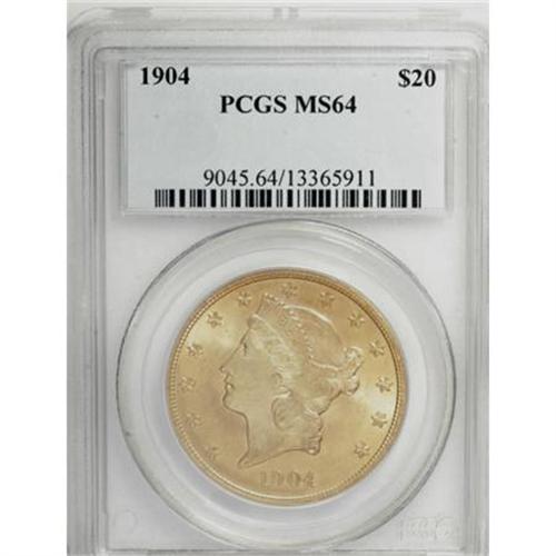 <B>1904 $20 MS64 PCGS.</B></I> Attractive apricot-gold luster embraces both sides of this near-Gem double eagle, and an attentive strike brings out sharp definition on the design features. A few trivial marks define the grade.<BR><BR><B>Coin Engraver:</B> James B. Longacre<BR><BR><b>Shipping:</b> Coins & Currency (<a target="_blank" href="http://www.heritageauctions.com/common/shipping.php">view shipping information</a>)