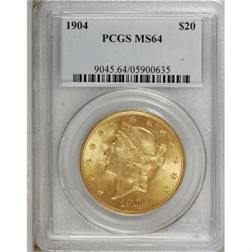 <B>1904 $20 MS64 PCGS.</B></I> A well struck example of this perennially popular type issue, slightly satiny with warm yellow-orange surfaces that show traces of have. A distinctive near-Gem.<BR><BR><B>Coin Engraver:</B> James B. Longacre<BR><BR><b>Shipping:</b> Coins & Currency (<a target="_blank" href="http://www.heritageauctions.com/common/shipping.php">view shipping information</a>)
