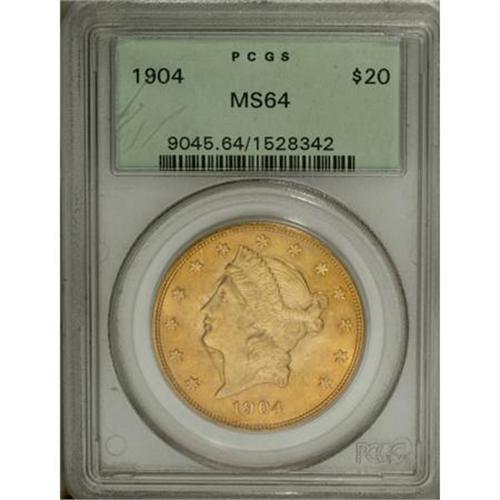 <B>1904 $20 MS64 PCGS.</B></I> The apricot-gold toning deepens toward the rims. Lustrous and well struck with pleasing preservation despite a faint vertical streak beneath the left (facing) wing. Encased in a green label holder.<BR><BR><B>Coin Engraver:</B> James B. Longacre<BR><BR><b>Shipping:</b> Coins & Currency (<a target="_blank" href="http://www.heritageauctions.com/common/shipping.php">view shipping information</a>)