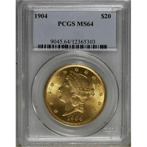 <B>1904 $20 MS64 PCGS.</B></I> PCGS Population (26058/3618). NGC Census: (28170/5525). Mintage: 6,256,797. Numismedia Wsl. Price for NGC/PCGS coin in MS64: $1,760. (#9045)<BR><BR><B>Coin Engraver:</B> James B. Longacre<BR><BR><b>Shipping:</b> Coins & Currency (<a target="_blank" href="http://www.heritageauctions.com/common/shipping.php">view shipping information</a>)