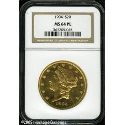 <B>1904 $20 MS64 Prooflike NGC.</B></I> A flashy and boldly struck example of this high mintage issue, which is nonetheless scarce with prooflike fields. Just a few small abrasions are seen amid myriad die polishing lines that help create the reflectivity.<BR><I>From The Richard J. Chouinard Collection of United States Coins, Part Two.</B></I> Lot:9388