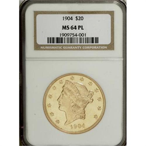 <B>1904 $20 MS64 Prooflike NGC.</B></I> The fields exhibit dazzling reflectivity, and the penetrating strike and unmarked surfaces further ensure the eye appeal. Census: 32 in 64 Prooflike, 10 finer (5/07).<BR><BR><b>Shipping:</b> Coins & Currency (<a target="_blank" href="http://www.heritageauctions.com/common/shipping.php">view shipping information</a>)