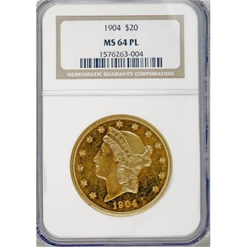 <B>1904 $20 MS64 Prooflike NGC.</B></I> Immensely reflective with sharply struck devices that emerge from liquid lemon-gold fields. This minimally marked and gorgeous survivor offers eye appeal that is a step above the typical near-Gem. Census: 36 in 64 Prooflike, 10 finer (11/07).<BR><BR><B>Coin Engraver:</B> James B. Longacre<BR><BR><b>Shipping:</b> Coins & Currency (<a target="_blank" href="http://www.heritageauctions.com/common/shipping.php">view shipping information</a>)