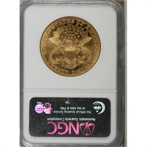 <B>1904 $20 MS64 Prooflike NGC.</B></I> The 1904, with a mintage of more than 6 million coins, is the most common date of the series. NGC alone has graded 28,000 plus pieces in MS64, the numerical grade of the present specimen. The service has saw fit to designate only 37 near-Gems, however, as Prooflike, along with 10 higher-graded coins. A well executed strike emboldens the design elements that stand out against the Prooflike fields. Both sides take on lovely yellow-gold coloration, and reveal just a few minute marks.<BR><BR><B>Coin Engraver:</B> James B. Longacre<BR><BR><b>Shipping:</b> Coins & Currency (<a target="_blank" href="http://www.heritageauctions.com/common/shipping.php">view shipping information</a>)