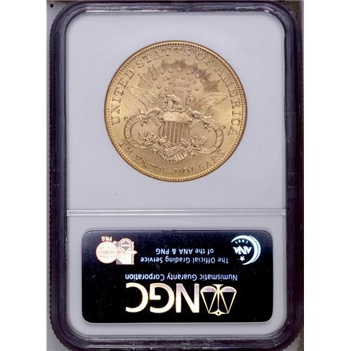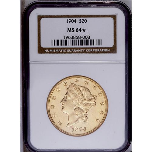 <B>1904<$20> MS64 <img border='0' src='http://www.heritagecoins.com/images/star.gif' width=10 height=10> NGC.</B></I> A flashy and boldly struck near-Gem whose clean surfaces and moderately prooflike obverse secured the Star designation (for superior eye appeal) from NGC.