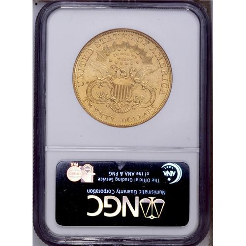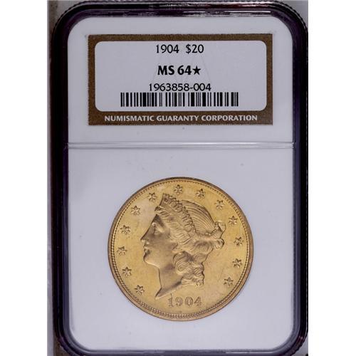 <B>1904<$20> MS64 <img border='0' src='http://www.heritagecoins.com/images/star.gif' width=10 height=10> NGC.</B></I> This flashy lemon-gold near-Gem is impressively undisturbed and offers impressive eye appeal. An assertively struck piece, worthy of a quality gold type set.