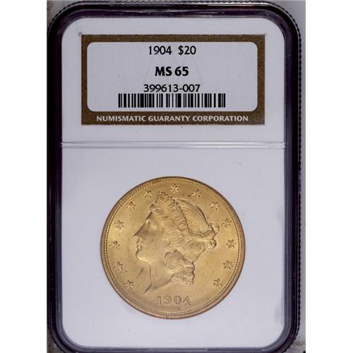 <B>1904<$20> MS65 NGC.</B></I> Bright swirling mint luster and showing rich copper-gold toning, with a bare minimum of surface marks. A lovely Gem example of this readily obtainable issue. <BR><BR><B>Importa