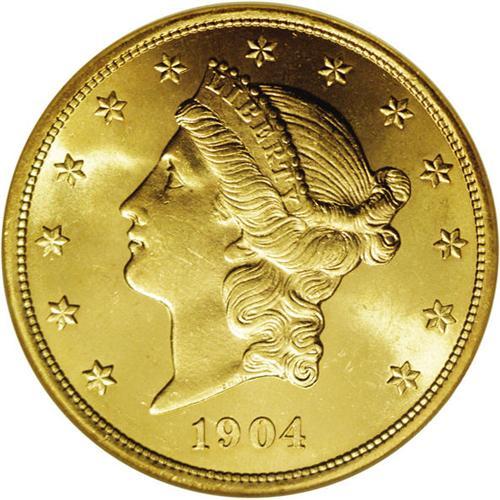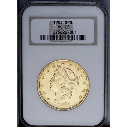 <B>1904<$20> MS65 NGC.</B></I> An exquisite Gem quality example with fully brilliant and highly lustrous satin surfaces, and exceptional bright yellow color. This is an aesthetically desirable example that will please the connoisseur. <BR><BR><B>Important notice:</B> Heritage usually auctions material at the rate of 200-250 lots per hour. On some occasions eBay Live bid software or the Internet may not be able to keep up with the pace of the auction. We recommend placing a realistic absentee bid now as insurance to avoid disappointment. Occasionally the auctioneer may eliminate or reject an eBay Live bid, and the auctioneer may also reopen a lot after the close of the eBay live bidding (usually because we missed an audience bid), and may reject your bid even if it shows you as the winning bidder. By bidding via eBay Live, you agree that Heritage may award the lot to another bidder at its sole discretion under the circumstances described above or any other reasonable circumstances. Since eBay bids are not shown to us until we open the lot on the floor, we treat those bids just like floor bids. In most cases the floor responds before the eBay bid is presented to us, due to Internet lag time, so for consistency we have made it a policy that floor bids are always considered first over tie eBay live bids. Also please note that all Heritage lots purchased through eBay Live carry a 20% Buyer's Premium. Please make sure you read the Terms and Conditions before you bid. This lot is being auctioned in conjunction with a live floor auction by Heritage Galleries & Auctioneers. All final auction and invoice information will be supplied by Heritage Galleries & Auctioneers, and all other information should be considered preliminary. Lot:4475 <BR><BR><B>Winning Notification and Billing:</B> After the FINAL session in this auction is complete, Heritage will send e-mail and snail mail invoices. This process normally takes several days. All final auction and invoice information will be supplied by Heritage Galleries & Auctioneers, and all other information should be considered preliminary. <BR><BR>This auction will be conducted on a live auction floor and over the Internet through eBay Live. If you choose to place an absentee bid, please take a moment to <font color='#0000ff'><u><a href='http://pages.ebay.com/liveauctions/help/before/laabsentee.html'>learn how eBay Live absentee bidding works</a></u></font><font color='#000000'>