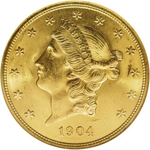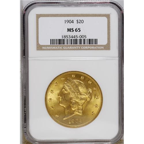 <B>1904 $20 MS65 NGC.</B></I> Booming luster and rich apricot patina dominate this well preserved gold type coin. The eye appeal is impressive, and the strike is sharp except for the customary minor blending in the central hair folds. The 1904 is the highest mintage issue, but pieces of exceptional quality are always in demand.<BR><BR><b>Shipping:</b> Coin/Currency (<a target="_blank" href="http://www.heritageauctions.com/common/shipping.php">view shipping information</a>)