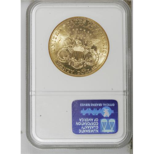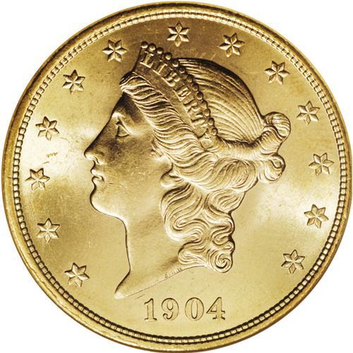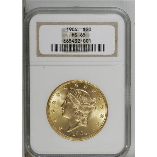 <B>1904 $20 MS65 NGC.</B></I> Dazzling cartwheel luster endows this meticulously struck and pleasing Gem. The obverse is remarkably free from contact, while the reverse has only two remotely mentionable marks, above the OL in DOLLARS and on the right (facing) wing. Most dates in the Liberty double eagle series are nearly unobtainable at the MS65 level, which focuses demand on those few available issues.<BR><BR><b>Shipping:</b> Coin/Currency (<a target="_blank" href="http://www.heritageauctions.com/common/shipping.php">view shipping information</a>)