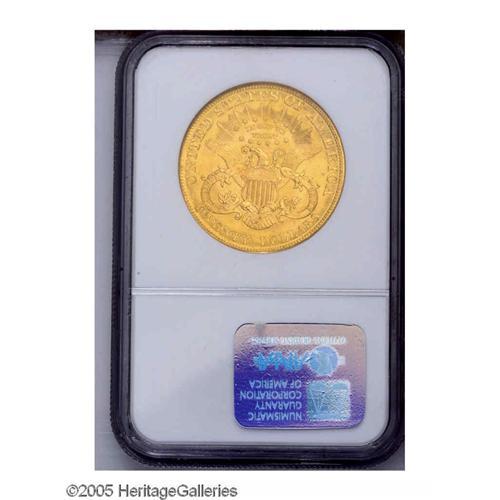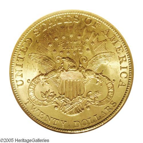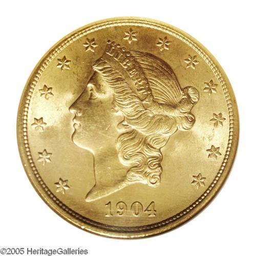 <B>1904<$20> MS65 NGC.</B></I> A smooth and pleasing Gem of this gold type favorite. Crisply struck on both the stars and the shield lines. A wispy pinscratch in the field above the hair bun prevents an even higher grade. The 1904 is familiar to bourse floor participants, but high quality pieces are always desired.<BR><I>From The Meads Point Collection.</B></I>