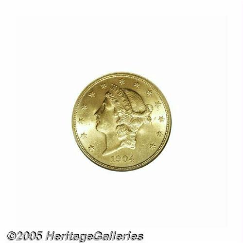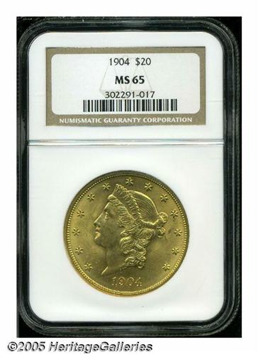 <B>1904<$20> MS65 NGC.</B></I> Satiny and especially well preserved, with an original golden-orange patina across both sides. The surfaces, particularly the fields, are refreshingly clean.