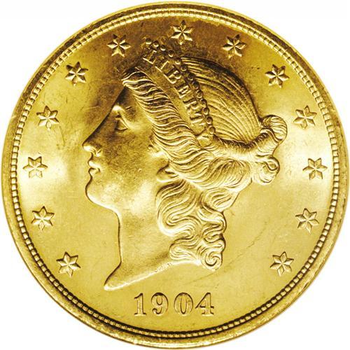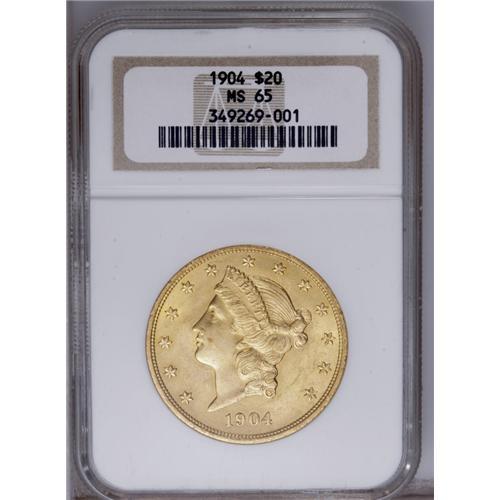 <B>1904 $20 MS65 NGC.</B></I> Sharply struck throughout, with radiant luster in the fields and ample mint frost on the devices. Although a common date, Gems are always in demand by type collectors.