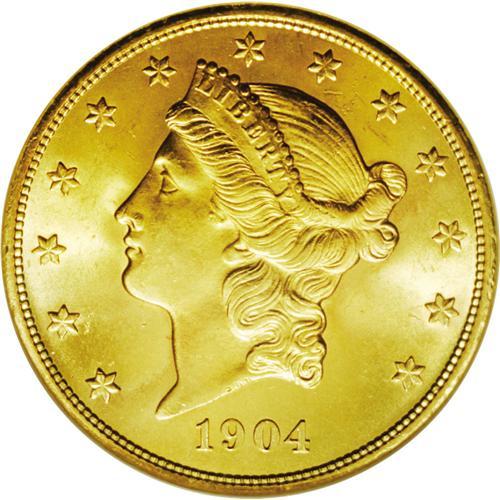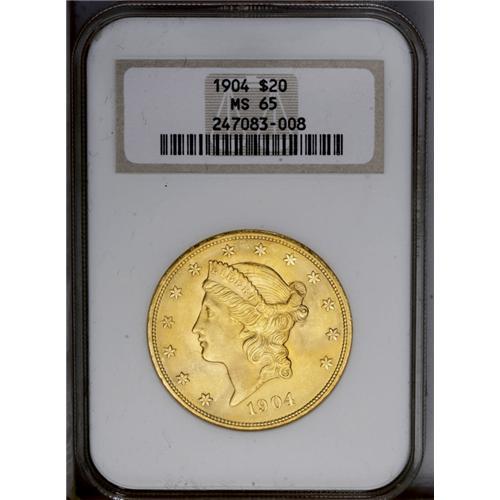 <B>1904<$20> MS65 NGC.</B></I> Superb, even for the grade, with lambent luster that shimmers on both sides. The marks are minimal and, while some stars above Liberty's head are incomplete, they are insignificant, given the overall high quality. <BR><BR><B>Important notice:</B> Heritage usually auctions material at the rate of 200-250 lots per hour. On some occasions eBay Live bid software or the Internet may not be able to keep up with the pace of the auction. We recommend placing a realistic absentee bid now as insurance to avoid disappointment. Occasionally the auctioneer may eliminate or reject an eBay Live bid, and the auctioneer may also reopen a lot after the close of the eBay live bidding (usually because we missed an audience bid), and may reject your bid even if it shows you as the winning bidder. By bidding via eBay Live, you agree that Heritage may award the lot to another bidder at its sole discretion under the circumstances described above or any other reasonable circumstances. Since eBay bids are not shown to us until we open the lot on the floor, we treat those bids just like floor bids. In most cases the floor responds before the eBay bid is presented to us, due to Internet lag time, so for consistency we have made it a policy that floor bids are always considered first over tie eBay live bids. Also please note that all Heritage lots purchased through eBay Live carry a 20% Buyer's Premium. Please make sure you read the Terms and Conditions before you bid. This lot is being auctioned in conjunction with a live floor auction by Heritage Galleries & Auctioneers. All final auction and invoice information will be supplied by Heritage Galleries & Auctioneers, and all other information should be considered preliminary. Lot:4478 <BR><BR><B>Winning Notification and Billing:</B> After the FINAL session in this auction is complete, Heritage will send e-mail and snail mail invoices. This process normally takes several days. All final auction and invoice information will be supplied by Heritage Galleries & Auctioneers, and all other information should be considered preliminary. <BR><BR>This auction will be conducted on a live auction floor and over the Internet through eBay Live. If you choose to place an absentee bid, please take a moment to <font color='#0000ff'><u><a href='http://pages.ebay.com/liveauctions/help/before/laabsentee.html'>learn how eBay Live absentee bidding works</a></u></font><font color='#000000'>