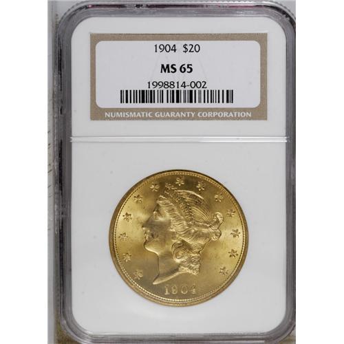<B>1904<$20> MS65 NGC.</B></I> The classic of the Type Three Liberty Head design, here represented by a lustrous and essentially pristine blazing orange-gold example. The strike is bold if not absolutely full, and perusal even with a loupe reveals a near-total absence of abrasions save for the most minute and undistracting sort. Considerable mint frost is seen on the obverse, as a plus.