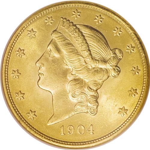 <B>1904 $20 MS65 NGC.</B></I> Two mints between themselves manufactured a prodigious quantity of more than 11 million double eagles in 1904, with Philadelphia the largest and San Francisco the second-largest mintage for the entire Liberty Head type, as well as the subtype with TWENTY DOLLARS. This exuberant example offers glowing orange-gold surfaces, a full strike, and scarcely a trace of distraction. Although even Gems of this plentiful issue number in the thousands at both services, the population thins out noticeably at the next grade level higher, into the low hundreds.<BR><BR><b>Shipping:</b> Coins & Currency (<a target="_blank" href="http://www.heritageauctions.com/common/shipping.php">view shipping information</a>)