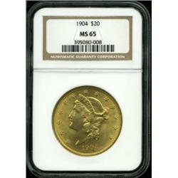 <table><tr><td><TABLE cellSpacing=0 cellPadding=0 width="100%" bgColor=#000000 border=0><TBODY> <TR><TD width="100%"><TABLE cellSpacing=1 cellPadding=3 width="100%" border=0><TBODY><TR><TD width="100%" bgColor=#79735c><FONT face=arial color=#ffffff size=3><B>Description</B> </FONT></TD></TR><TR><TD width="100%" bgColor=#ffffff><FONT face=arial size=2><B>1904 $20 MS65 NGC.</B></I> Vivid orange-gold patina blankets this sharply struck, uncommonly well preserved Gem. A few light abrasions are scattered over each side, but splendid cartwheel luster ensures a high degree of eye appeal. Extremely scarce any finer. </FONT></TD></TR></TBODY></TABLE></TD></TR></TBODY></TABLE><BR><A name=PricesRealized></A><TABLE cellSpacing=0 cellPadding=0 width="100%" bgColor=#000000 border=0><TBODY><TR><TD width="100%"><TABLE cellSpacing=1 cellPadding=3 width="100%" border=0><TBODY><TR><TD width="100%" bgColor=#79735c><A name=PR><FONT face=arial color=#ffffff size=3><B>Previous Prices from Heritage Auctions</B> </FONT></A></TD></TR><TR><TD bgColor=#f6f6ed><TABLE cellSpacing=0 cellPadding=0 width="100%" border=1><TBODY><TR><TD align=middle width="33%"><B>Date</B></TD><TD align=middle width="33%"><B>Service</B></TD><TD align=middle width="33%"><B>Price</B></TD></TR><TR bgColor=whitesmoke><TD width="33%"><B>04/10/2001</B></TD><TD width="33%">NGC</TD><TD width="33%">$1,400.00</TD></TR><TR bgColor=whitesmoke><TD width="33%"><B>09/20/2003</B></TD><TD width="33%">PCGS</TD><TD width="33%">$4,140.00</TD></TR><TR bgColor=whitesmoke><TD width="33%"><B>05/31/2003</B></TD><TD width="33%">NGC</TD><TD width="33%">$2,558.75</TD></TR><TR bgColor=whitesmoke><TD width="33%"><B>05/03/2003</B></TD><TD width="33%">PCGS</TD><TD width="33%">$2,990.00</TD></TR><TR bgColor=whitesmoke><TD width="33%"><B>01/11/2003</B></TD><TD width="33%">NGC</TD><TD width="33%">$3,105.00</TD></TR><TR bgColor=whitesmoke><TD width="33%"><B>09/28/2002</B></TD><TD width="33%">PCGS</TD><TD width="33%">$2,760.00</TD></TR><TR bgColor=whitesmoke><TD width="33%"><B>06/08/2002</B></TD><TD width="33%">PCGS</TD><TD width="33%">$2,415.00</TD></TR><TR bgColor=whitesmoke><TD width="33%"><B>01/12/2002</B></TD><TD width="33%">NGC</TD><TD width="33%">$2,070.00</TD></TR><TR bgColor=whitesmoke><TD width="33%"><B>08/08/2001</B></TD><TD width="33%">NGC</TD><TD width="33%">$1,725.00</TD></TR><TR bgColor=whitesmoke><TD width="33%"><B>05/31/2001</B></TD><TD width="33%">NGC</TD><TD width="33%">$1,840.00</TD></TR><TR bgColor=whitesmoke><TD width="33%"><B>02/23/2001</B></TD><TD width="33%">NGC</TD><TD width="33%">$1,725.00</TD></TR><TR bgColor=whitesmoke><TD width="33%"><B>02/23/2001</B></TD><TD width="33%">NGC</TD><TD width="33%">$1,840.00</TD></TR><TR bgColor=whitesmoke><TD width="33%"><B>02/23/2001</B></TD><TD width="33%">NGC</TD><TD width="33%">$1,725.00</TD></TR><TR bgColor=whitesmoke><TD width="33%"><B>02/23/2001</B></TD><TD width="33%">NGC</TD><TD width="33%">$1,725.00</TD></TR><TR bgColor=whitesmoke><TD width="33%"><B>02/23/2001</B></TD><TD width="33%">NGC</TD><TD width="33%">$1,725.00</TD></TR><TR bgColor=whitesmoke><TD width="33%"><B>10/06/2000</B></TD><TD width="33%">NGC</TD><TD width="33%">$1,638.75</TD></TR><TR bgColor=whitesmoke><TD width="33%"><B>08/07/2000</B></TD><TD width="33%">NGC</TD><TD width="33%">$1,499.60</TD></TR><TR bgColor=whitesmoke><TD width="33%"><B>06/10/2000</B></TD><TD width="33%">PCGS</TD><TD width="33%">$1,667.50</TD></TR><TR bgColor=whitesmoke><TD width="33%"><B>06/07/2000</B></TD><TD width="33%">PCGS</TD><TD width="33%">$1,610.00</TD></TR><TR bgColor=whitesmoke><TD width="33%"><B>04/14/2000</B></TD><TD width="33%">PCGS</TD><TD width="33%">$2,012.50</TD></TR><TR bgColor=whitesmoke><TD width="33%"><B>01/07/2000</B></TD><TD width="33%">PCGS</TD><TD width="33%">$1,811.25</TD></TR><TR bgColor=whitesmoke><TD width="33%"><B>11/18/1999</B></TD><TD width="33%">PCGS</TD><TD width="33%">$3,680.00</TD></TR><TR bgColor=whitesmoke><TD width="33%"><B>09/25/1999</B></TD><TD width="33%">NGC</TD><TD width="33%">$2,127.50</TD></TR><TR bgColor=whitesmoke><TD width="33%"><B>04/23/1999</B></TD><TD width="33%">NGC</TD><TD width="33%">$2,530.00</TD></TR><TR bgColor=whitesmoke><TD width="33%"><B>01/08/1999</B></TD><TD width="33%">NGC</TD><TD width="33%">$2,875.00</TD></TR><TR bgColor=whitesmoke><TD width="33%"><B>09/26/1998</B></TD><TD width="33%">PCGS</TD><TD width="33%">$2,530.00</TD></TR><TR bgColor=whitesmoke><TD width="33%"><B>09/26/1998</B></TD><TD width="33%">PCGS</TD><TD width="33%">$2,587.50</TD></TR><TR bgColor=whitesmoke><TD width="33%"><B>09/26/1998</B></TD><TD width="33%">PCGS</TD><TD width="33%">$2,875.00</TD></TR><TR bgColor=whitesmoke><TD width="33%"><B>09/26/1998</B></TD><TD width="33%">NGC</TD><TD width="33%">$4,140.00</TD></TR><TR bgColor=whitesmoke><TD width="33%"><B>09/26/1998</B></TD><TD width="33%">PCGS</TD><TD width="33%">$2,645.00</TD></TR><TR bgColor=whitesmoke><TD width="33%"><B>09/26/1998</B></TD><TD width="33%">PCGS</TD><TD width="33%">$5,175.00</TD></TR><TR bgColor=whitesmoke><TD width="33%"><B>08/07/1998</B></TD><TD width="33%">PCGS</TD><TD width="33%">$6,440.00</TD></TR><TR bgColor=whitesmoke><TD width="33%"><B>08/08/1998</B></TD><TD width="33%">PCGS</TD><TD width="33%">$2,530.00</TD></TR><TR bgColor=whitesmoke><TD width="33%"><B>03/21/1998</B></TD><TD width="33%">PCGS</TD><TD width="33%">$3,335.00</TD></TR><TR bgColor=whitesmoke><TD width="33%"><B>03/21/1998</B></TD><TD width="33%">PCGS</TD><TD width="33%">$2,760.00</TD></TR><TR bgColor=whitesmoke><TD width="33%"><B>09/18/1996</B></TD><TD width="33%">PCGS</TD><TD width="33%">$3,630.00</TD></TR><TR bgColor=whitesmoke><TD width="33%"><B>03/16/1996</B></TD><TD width="33%">NGC</TD><TD width="33%">$3,080.00</TD></TR><TR bgColor=whitesmoke><TD width="33%"><B>03/16/1996</B></TD><TD width="33%">NGC</TD><TD width="33%">$2,750.00</TD></TR><TR bgColor=whitesmoke><TD width="33%"><B>03/16/1996</B></TD><TD width="33%">NGC</TD><TD width="33%">$2,530.00</TD></TR><TR bgColor=whitesmoke><TD width="33%"><B